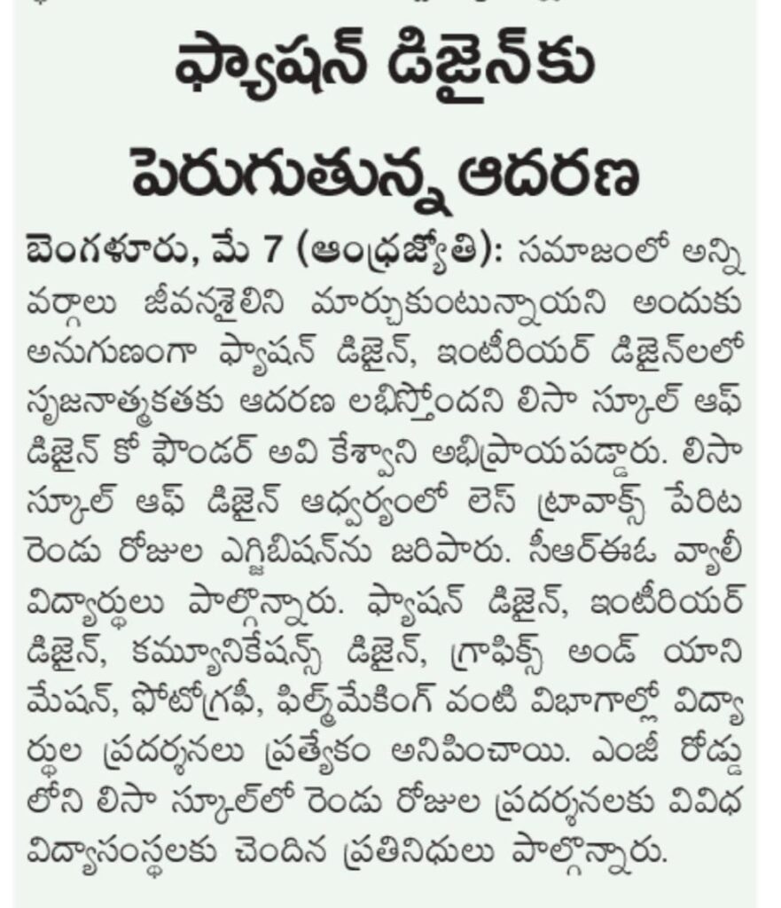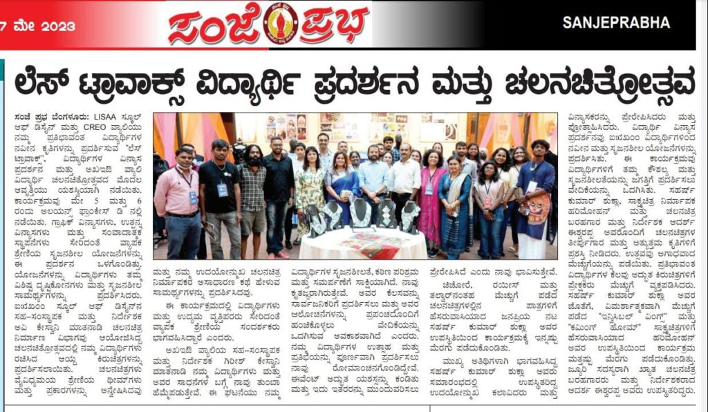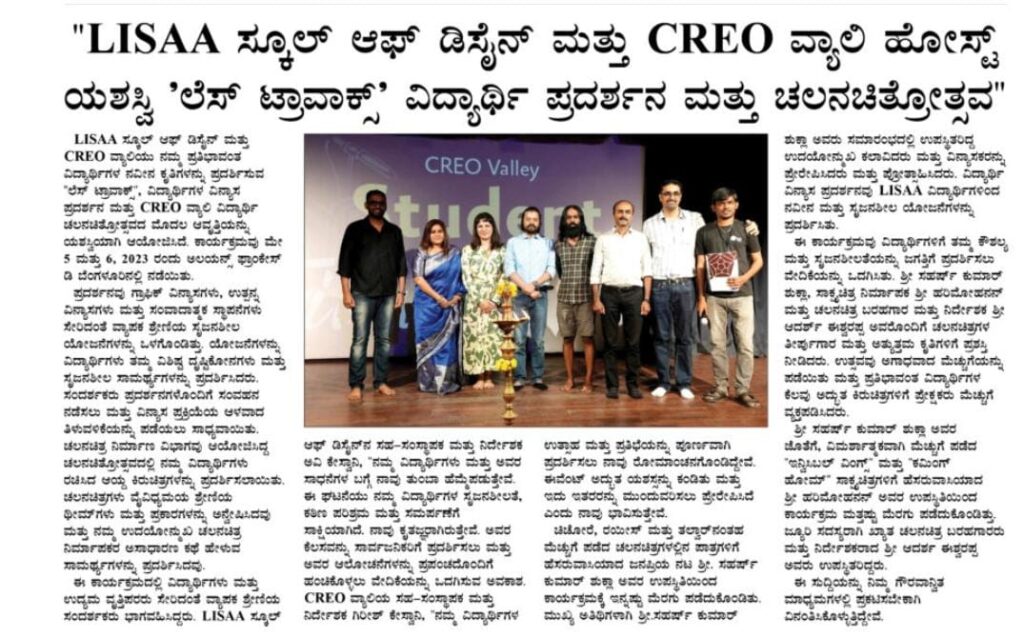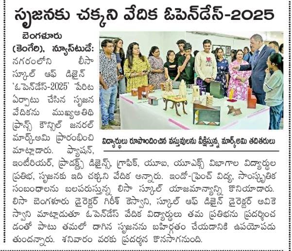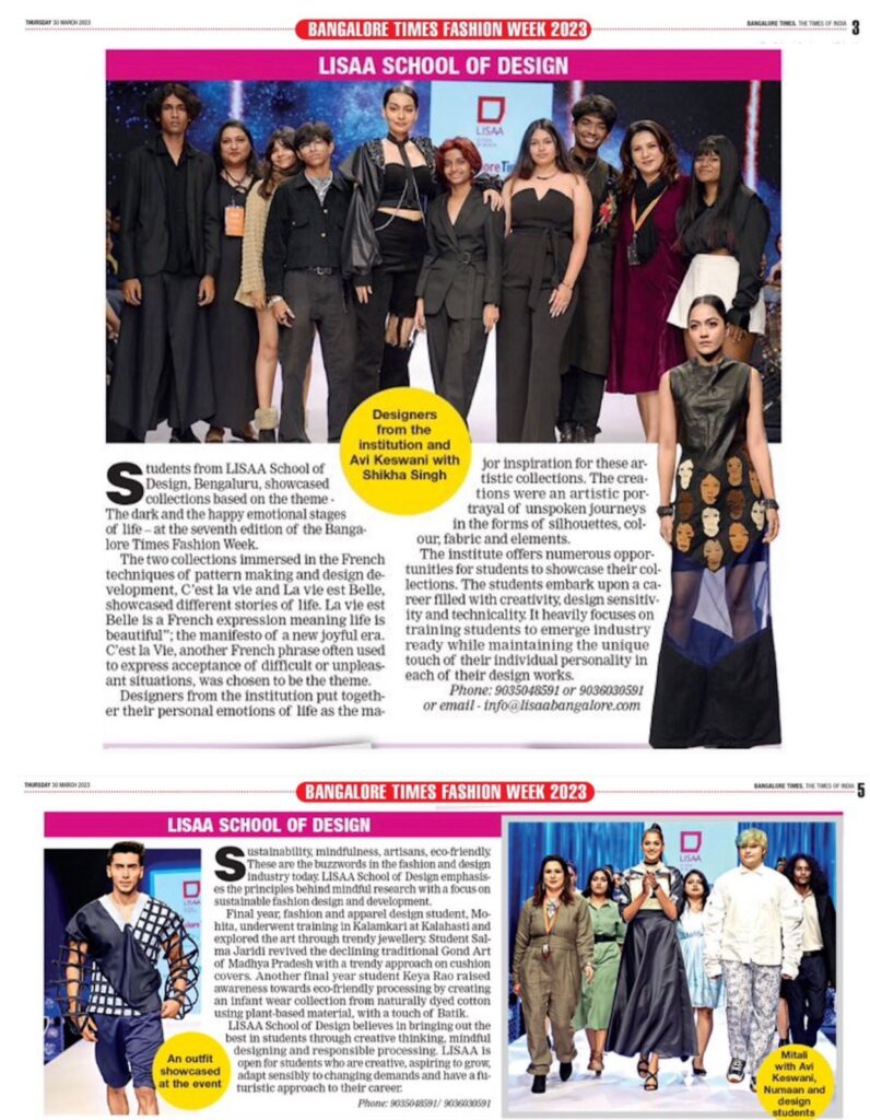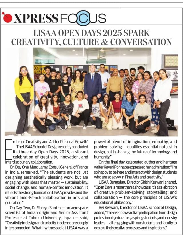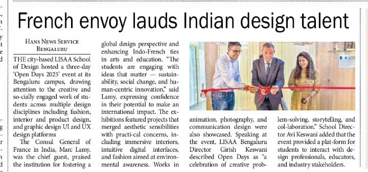 Open Days 2025 – LISAA School of Design, Bengaluru French Consul Marc Lamy highlights Indo-French ties, student exchange, and cultural collaboration. Marc Lamy Highlights Indo-French Educational and Cultural Bonds at LISAA Open Day 2025 Student Creativity Shines at LISAA School Exhibition Three-Day Open Days 2025 at LISAA School of Design LISAA School of Design’s 2025 Open Days Shine on TV9 Spotlight Consul General of France in India, Marc Lamy lauds LISAA School of Design’s global design perspective at their Open House. Open Days at LISAA School of Design Sparking Creativity, Culture & Conversation LISAA School of Design Open Day 2025 Highlighted in “KannadaPrabha” France Consul Marc Lamy inaugurates the Open Day 2025 Program at LISA School of Design. LISAA Open Day 2025: A Gateway to Unleashing Creativity Nargis Fakhri with Ms. Avi Keswani at the launch of ‘LISAA School of Design’ in Bangalore. Ms. Avi Keswani, Director, Lisaa Bangalore. French students learning traditional block printing and dyeing methods at LISAA Bengaluru. Avi Keswani, Director, LISAA School of Design with Director Prashant Ranganath from Bakeflicks for the upcoming debut movie Gully 7 during a campus placement drive Mr Girish Keswani speaking at LISAA Open Day 2022. Kannada Film Actress Sonu Gowda with Mr Girish Keswani & Ms Avi Keswani, Founder and Director, LISAA School of Design. LISAA School of Design came out with a message for the Bengalureans asking them to stay away from crackers. Ms. Avi Keswani, was a speaker at AIFAD on sustainability in the era of Industry 4.0. Ms. Avi Keswani at Whats’s Next event at Pearl Academy. Mr. Mossi visit to LISAA School of Design. Ms. Avi Keswani having panel discussions at LISAA Open Day 2022. Ms. Avi Keswani having panel discussions at LISAA Open Day 2022. Prakash Belawadi at LISAA School of Design. Parmeshwar visit to LISAA School of Design. Neha Dhupia at the CREO Valley launch event. LISAA design collections presented at Bangalore Times Fashion Week 2023. LISAA design collections presented at Bangalore Times Fashion Week 2023. LISAA featured in one of the leading newspaper of our country Bangalore Times. Les Travaux – Students Design Exhibition featured in “Sanje Prabha” Les Travaux – Students Design Exhibition featured in “Vishwavani” Les Travaux – Students Design Exhibition featured in “Bhatatha Sarathi” Actor Saharsh at CREO Valley Students Film Festival Actor Saharsh at CREO Valley Students Film Festival